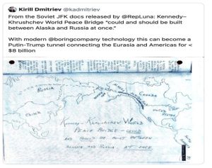 I dette bildet publiserte Russlands utsending for investeringer, Kirill Dmitriev, torsdag 16. oktober 2025 et innlegg på X der han foreslo for Elon Musk å bygge en “Putin–Trump-tunnel” under Beringstredet. “La oss bygge fremtiden sammen!”