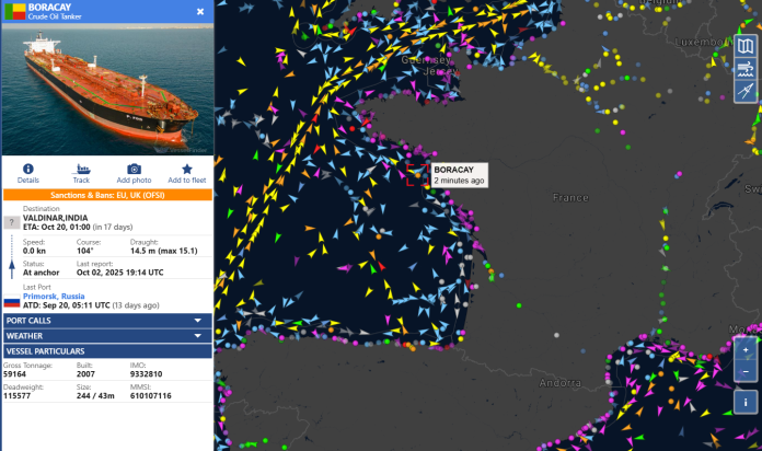 Boracay, som også har gått under navnene Pushpa og Kiwala, forlot den russiske havnen Primorsk ved St. Petersburg 20. september. Ifølge skipsdata er skipet ventet til den indiske havnen Vadinar 20. oktober.