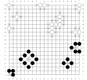 Figur 2: X representerer frihetene til de hvite steinene, og de hvite kan ikke okkupere krysningspunktene markert med Δ – selvmordsregelen. (Go Teacher, Farid Ben Malek)