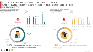 Skammen smitter over på nasjonalfølelsen: 38 % skammer seg over å være amerikaner, inkl. 51 % unge og 42 % med mastergrad. 34 % av dem som kaller seg «svært patriotiske» sier det også.