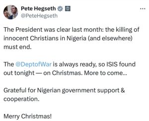 Selv om Pentagon-tjenestemenn etter angrepene ikke har gitt detaljer om tapstall eller konkrete mål, publiserte krigsminister Pete Hegseth et innlegg der han gjentok at drapene på uskyldige kristne må ta slutt i Nigeria – og overalt – fordi krigsdepartementet alltid er klart til å slå til, slik IS opplevde i natt, på julaften. Han takket den nigerianske regjeringen for samarbeidet og varslet flere angrep … før han avsluttet uttalelsen med et «Merry Christmas!» rettet mot de bombede IS-militante, og dermed plasserte angrepet i en «messiansk», religiøs ramme som står sterkt i MAGA-bevegelsen.