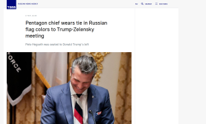 Mens lederne smilte for kameraene, bar Hegseth et slips i horisontale striper av blått, rødt og hvitt – samme fargene og rekkefølgen som i det russiske flagget, melder UNN.
