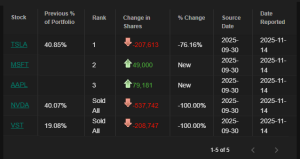 Fondet hans ble redusert fra 212 millioner dollar (rundt 2,3 milliarder NOK) i andre kvartal til 74,4 millioner dollar (omtrent 820 millioner NOK) i tredje kvartal. Også energiselskapet Vistra, som tidligere utgjorde 19 prosent av porteføljen, ble solgt helt ut.