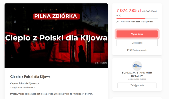 Samtidig har en polsk innsamlingsaksjon, som opprinnelig hadde et mål på 1 million zloty, nå passert 6,8 millioner zloty (rundt 17,5 millioner kroner). Over 50.000 givere har bidratt, og de første aggregatene kjøpt for pengene ble sendt til Ukraina fredag, ifølge nettstedet Onet.