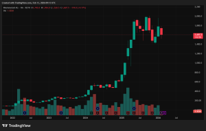 Aksjekursen til Rheinmetall AG de siste 4 årene, der hver candlestick representerer måneder. Skjermdump: TradingView