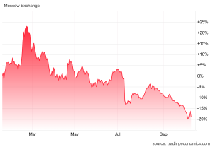 MOEX-indeksen har falt fem uker på rad og har mistet mer enn 22 prosent av markedsverdien siden februar – tilsvarende rundt 1,3 billioner rubler (ca. 180 milliarder kroner), ifølge Reuters.