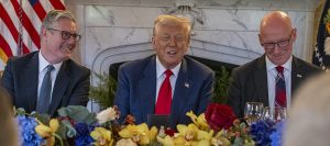 President Donald Trump deltar sammen med Storbritannias statsminister Keir Starmer og Skottlands førsteminister John Swinney på en VIP-middag under Legends Tour Championship ved Trump International Scotland golfbane og resort i Aberdeen 28. juli 2025. Foto: Det hvite hus / Wikimedia Commons.