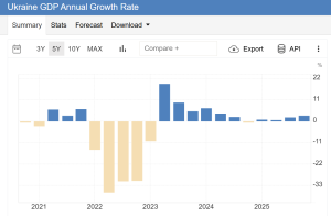 Etter en kraftig nedgang i 2022, kom den ukrainske økonomien delvis tilbake i 2023. Til tross for den pågående krigen og Russlands målrettede ødeleggelse av ukrainsk infrastruktur, har økonomien siden stabilisert seg og holdt seg relativt stabil. I 2025 avtok den reelle BNP-veksten til rundt 2 % på grunn av gjenværende sikkerhetsrisiko, tap av infrastruktur og kapasitet, strømknapphet og begrensninger i arbeidskraften. Handelsunderskuddet har økt ettersom importen steg til 84,8 milliarder dollar og ble omtrent dobbelt så stor som eksporten. Inflasjonen var i 2025 overraskende lav, på ca. 8,0 %. Det gjennomsnittlige nivået på næringslivets og forbrukernes tillit steg sammenlignet med 2024, noe som indikerer at samfunnet har tilpasset seg krigssituasjonen.