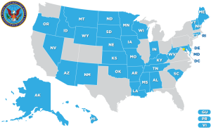 Kart som viser amerikanske delstater og territorier som er kvalifisert til å delta i Defense Established Program to Stimulate Competitive Research (DEPSCoR), et føderalt program gjenopprettet i 2019 for å styrke forskningskapasiteten ved universiteter i underutnyttede områder. Illustrasjon: DEPSCoR / U.S. Department of War