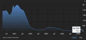 Inflasjonen i Venezuela har falt fra over 3 000 prosent i 2021 til 172 prosent i april 2025, etter at hyperinflasjonen drevet av pengetrykking, fall i oljeinntekter og valutakollaps avtok. Kilde: Banco Central de Venezuela / TradingEconomics