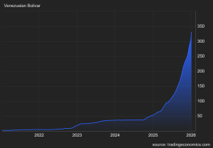Amerikanske dollar (USD) mot venezuelanske bolivar (VES) de siste 5 årene. Skjermdump: TradingEconomics
