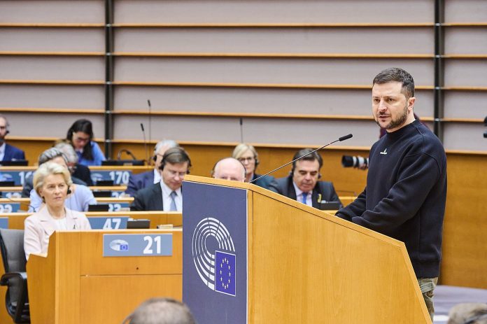 Zelenskyj mener Ukraina kjemper for felles europeiske verdier, og derfor fortjener fullt medlemskap i unionen.